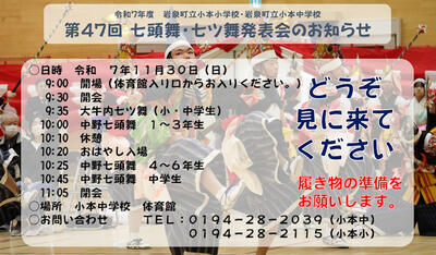大きな行事である七頭舞・七ツ舞発表会が終わり、小本小学校は落ち着いた日々を過ごしております。今朝は天気予報どおり、雪がちらつきました。が、積もることもなく、風が冷たいものの晴れています。今日は、宮古教育事務所からお客様がいらしたので、子どもたちの勉強の様子を見ていただきました。まず、どの学級も一生懸命に学習に取り組んでいることや自分で学習できていることを感じながら取り組めていることが素晴らしいと褒めていただきました。2学期もあと1カ月を切りました。頑張りましょう。