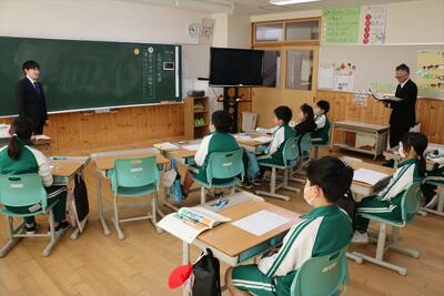 11月18日、小本小学校・小本中学校の校舎で岩手県社会科教育研究会宮古大会が開催されました。岩手県内の先生方が100名ほど、いらっしゃいました。小本小の4年生9名もその中で、「地域の人たちが受け継ぐ伝統行事~小本の誇り、七頭舞~」の学習を見ていただきました。4階の多目的室を授業会場にして行われた授業は、思ったよりたくさんの先生方に参観されながら進みました。教室の中にこんなに人がいる状態で学習したことはないであろう子どもたち。すごく緊張したことと思いますが、手をあげて、堂々と発表する姿はとても素晴らしいものでした。たくさん考え、たくさん発言した子どもたち、すごかったよ。終わったあと、教室に戻る子どもたちに声をかけた瞬間のほっとしながらもどこか誇らしげな顔が強く印象に残りました。授業を見せてくれた4つの学級の子どもたち、この素晴らしい子どもたちを見に来てくださった先生方、ありがとうございました。
