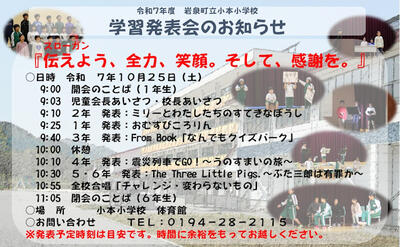 外は冷たい雨が降っている小本です。さて、子どもたちは来週に迫った学習発表会に向けて、準備を進めています。各学年が今年学習したことを工夫しながら、発表する学習発表会です。学習したことを保護者のみなさんや地域のみなさんに伝えるためにどうすればいいか。発表の練習をしたり、発表するための準備をしたり、みんな、聞いてくださる方の反応を考えながら、がんばっている気持ちが伝わってきます。あと、10日を切りました。がんばっていこう!