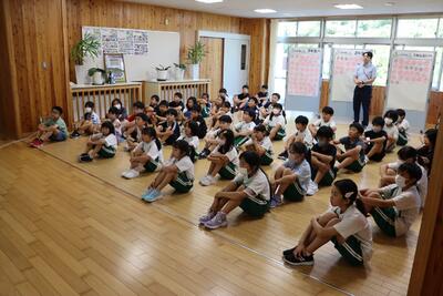 そして、全国に負けないくらい小本も暑い。今日は熱中症予防情報が厳重警戒だったため、外遊びができず、体育館で遊びます。小本小の体育館の素晴らしいところはクーラーが入っているわけでもないのに、涼し目なところです。でも、窓を開けてしまうと熱風が入ってきます。3年生以上がプール学習のため、体育館は1・2年生の貸し切りだったようです。