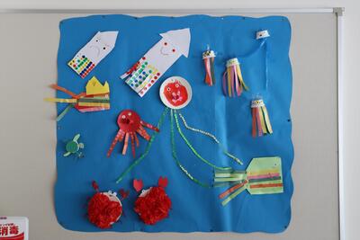 廊下には1学期に頑張った作品が飾られていました。こちらも新しいものに少しずつ更新されています。子どもたちの足跡ですね。今日は学期末の午前授業なので、楽しみにしている子どもたちのテンションがとても高い小本小でした。