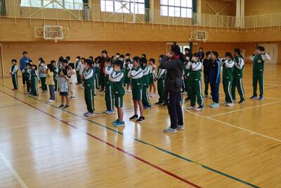 全校が体育館に集まって、音楽に親しむ日です。今日は声の出し方について練習し、耳の下のところを触りながら発声練習をしています。そして、「チャレンジ」という楽曲を全校生徒で歌いました。教わったことを一生懸命やってみる子どもたちです。いつも元気な声が響く子どもたちのうたですが、今日は元気なうえに、響きがいいような。どんどんステップアップできたらいいですね。