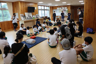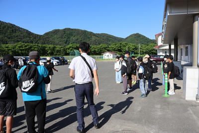 よく晴れた6日の朝。たくさんの保護者の方に見送られ、子どもたちは元気に小本小学校を出発しました。