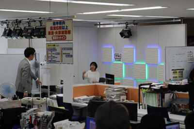 2日目のスタートはテレビ岩手。普段見ているテレビですが、想像以上にたくさんの人がかかわっていることを実際に見ることができました。そして、テレビで見ているアナウンサーさんやテレビのセットにテンションがあがります。穴澤さんにパークランドの天気は大丈夫といっていただき、大変心強く思いました。