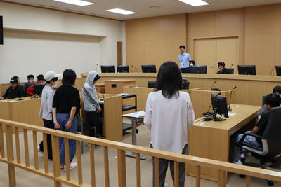 さて、次の裁判所。基本的には撮影禁止のため、子どもたちの様子を記録できないと思っていたのですが、説明のために訪れた部屋の中だけは撮影可とのことで、子どもたちの模擬裁判です。裁判官、検察官、弁護人などの役割を決めて、裁判の進め方を体験しました。その際、罪状や判決などはすべてアドリブ。役割を変えて何度も行う模擬裁判。やりたい役が重なり大変でしたが、びっくりするほどスラスラ出てくるアドリブ。