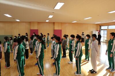 今日の小本小学校は音楽朝会でスタートでした。歌を歌う前に、準備体操です。毎朝寒いので、固まっている体では確かにいい声は出ませんね。