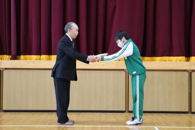 今日のスタートは児童朝会です。まず最初に、岩泉町社会福祉協議会の方にいらしていただき、先日、子どもたちが行った赤い羽根共同募金で集めたお金を手渡しました。児童会の子どもたちが1週間、あいさつ運動を行いながら、募金活動をしました。みんなの気持ちが世の中の力になります。