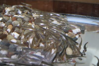 先日まで、ほとんどの稚魚が水槽の底でじっとしていましたが、実が軽くなったからなのか、最近は水槽の上の方を泳いでいる稚魚が増えてきました。水槽の水は右側から左側に流れているので、多くの稚魚が右向きで泳いでいる姿は2か月後に迫った旅立ちのために、練習しているようです。エサがもらえるまであと1週間。みんな頑張れー!そして、泳ぎも上手になるよう練習しましょう。