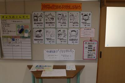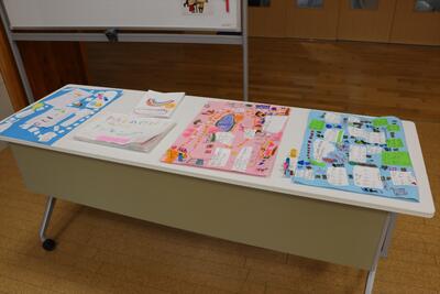 玄関を入ってすぐにあるホールには、1年生の作品が展示されています。これは、1年生の子どもたちが1年間を振り返り、自分の成長をまとめた作品のようです。本の形にまとめられた作品は2点、すごろくの形にまとめられた作品は3点。1年間で学習した内容を、絵や文章で上手に表現していました。素晴らしい出来です。