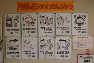 保健室前の掲示板も1年間のまとめとなっています。1年間の生活の振り返りについて、小本の子どもたちはどうだったかな?まだ、見ていない人は、ぜひ診断してみてくださいね。